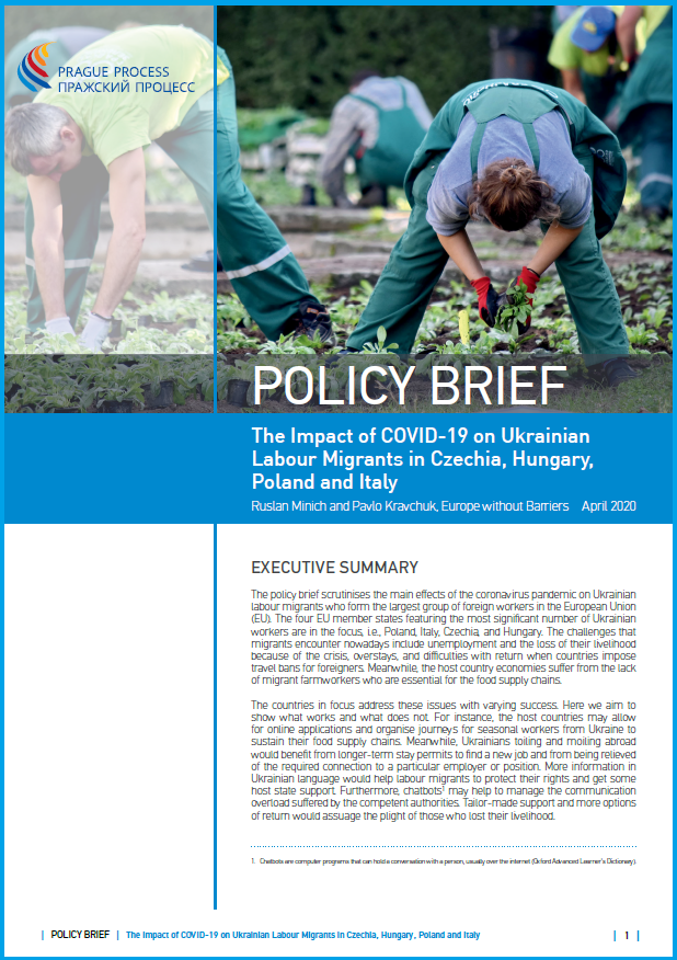 The policy brief scrutinises the main effects of the coronavirus pandemic on Ukrainian labour migrants who form the largest group of foreign workers in the European Union (EU). The four EU member states featuring the most significant number of Ukrainian workers are in the focus, i.e., Poland, Italy, Czechia, and Hungary. The challenges that migrants encounter nowadays include unemployment and the loss of their livelihood because of the crisis, overstays, and difficulties with return when countries impose travel bans for foreigners. Meanwhile, the host country economies suffer from the lack of migrant farmworkers who are essential for the food supply chains.