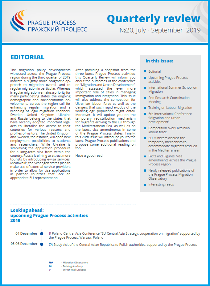 After providing a snapshot from the three latest Prague Process activities, this Quarterly Review will inform you about the outcomes of the conference on “Migration and Urban Development”, which assessed the ever more important role of cities in managing immigration and integration. This issue will also address the competition for the Ukrainian labour force as well as the dangers that such rapid exodus of the working-age population might entail. Moreover, it will update you on the temporary redistribution mechanism for migrants arriving in the EU through the Mediterranean Sea, as well as on the latest visa amendments in some of the Prague Process states. Finally, this 20th issue will introduce you to the latest Prague Process publications and propose some additional reading on top.