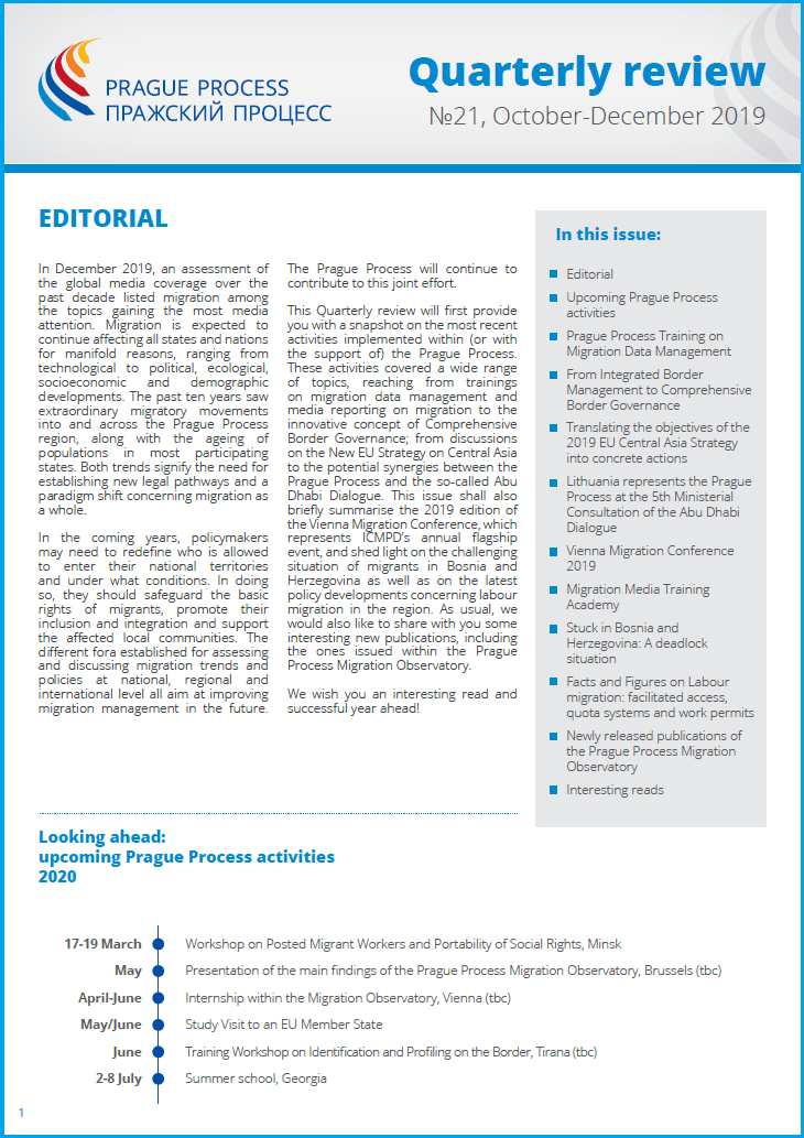 This Quarterly review will first provide you with a snapshot on the most recent activities implemented within (or with the support of) the Prague Process. These activities covered a wide range of topics, reaching from trainings on migration data management and media reporting on migration to the innovative concept of Comprehensive Border Governance; from discussions on the New EU Strategy on Central Asia to the potential synergies between the Prague Process and the so-called Abu Dhabi Dialogue. This issue shall also briefly summarise the 2019 edition of the Vienna Migration Conference, which represents ICMPD’s annual flagship event, and shed light on the challenging situation of migrants in Bosnia and Herzegovina as well as on the latest policy developments concerning labour migration in the region. As usual, we would also like to share with you some interesting new publications, including the ones issued within the Prague Process Migration Observatory.