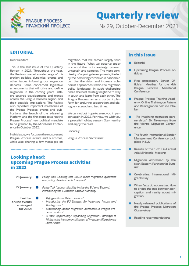 This is the last issue of the Quarterly Review in 2021. Throughout the year, the Review covered a wide range of migration policies, dynamics, events and other issues informing our migration debates. Some concerned legislative amendments that will drive and define migration in the coming years. Others covered developments and trends across the Prague Process region and their possible implications. The Review also reported important milestones of the Prague Process: events and publications, the launch of the e-learning Platform and the first steps towards the Prague Process’ new political mandate to be granted by the Ministerial Conference in October 2022.
