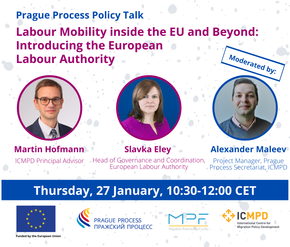 The Prague Process Policy Talk: ‘Labour Mobility inside the EU and Beyond: Introducing the European Labour Authority’, with Ms Slavka Eley, Head of Governance and Coordination at the European Labour Authority (ELA), and Mr Martin Hofmann, ICMPD Principal Advisor, is taking place on 27 January 2022 at 10:30 CET.