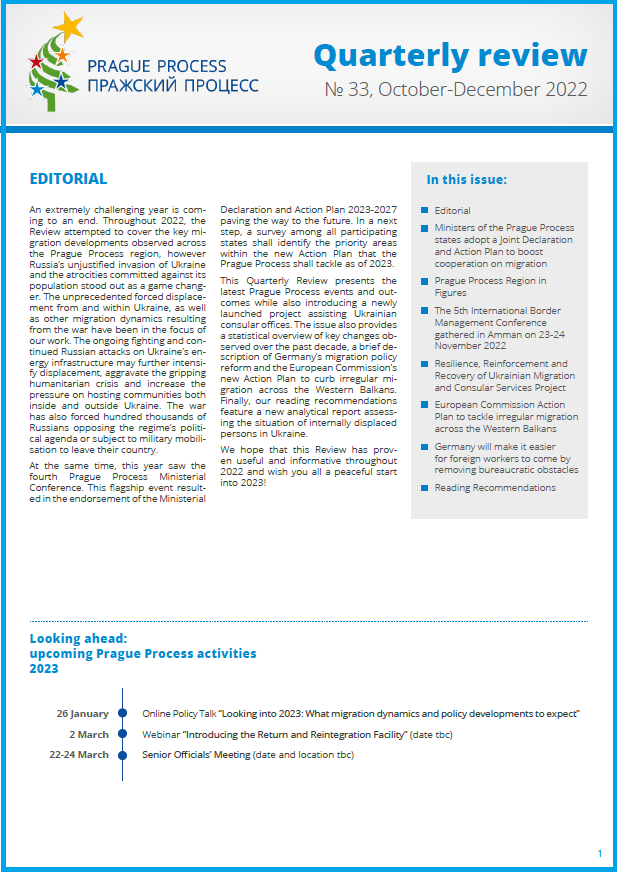 Throughout 2022, the Prague Process Quarterly Review attempted to cover the key migration developments observed across the Prague Process region, however Russia’s unjustified invasion of Ukraine stood out as a game changer. The unprecedented forced displacement from and within Ukraine, as well as other migration dynamics resulting from the war have been in the focus of our work. The ongoing fighting and continued Russian attacks on Ukraine’s energy infrastructure may further intensify displacement, aggravate the gripping humanitarian crisis and increase the pressure on hosting communities both inside and outside Ukraine. The war has also forced hundred thousands of Russians opposing the regime’s political agenda or subject to military mobilisation to leave their country.