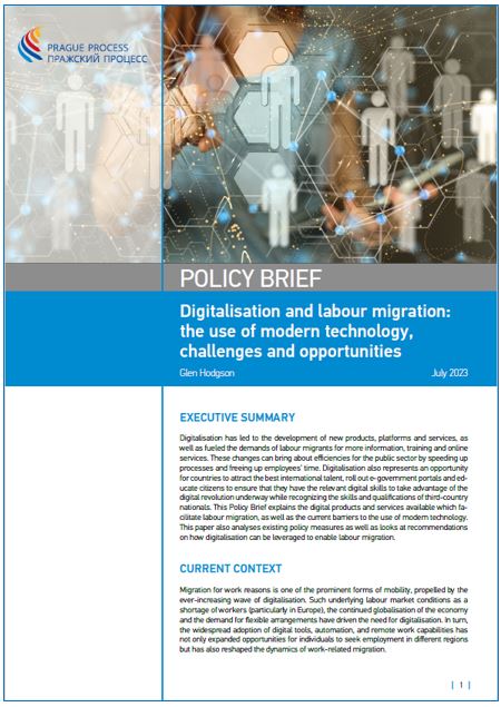 Digitalisation has led to the development of new products, platforms and services, as well as fueled the demands of labour migrants for more information, training and online services. These changes can bring about efficiencies for the public sector by speeding up processes and freeing up employees’ time. Digitalisation also represents an opportunity for countries to attract the best international talent, roll out e-government portals and educate citizens to ensure that they have the relevant digital skills to take advantage of the digital revolution underway while recognizing the skills and qualifications of third-country nationals. This Policy Brief explains the digital products and services available which facilitate labour migration, as well as the current barriers to the use of modern technology. This paper also analyses existing policy measures as well as looks at recommendations on how digitalisation can be leveraged to enable labour migration.