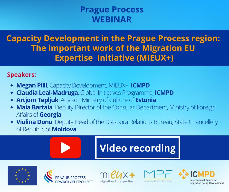 This webinar presented the capacity development work of the EU-funded Migration EU Expertise (MIEUX+) Initiative in several Prague Process countries. Joined by experts and partners, MIEUX+ provided insights on a variety of migration topics, illustrated through its recent actions in Azerbaijan, Georgia and Moldova. The thematic scope ranged from integration, to applying a whole-of-government approach and from crisis preparedness to diaspora engagement. The webinar thus presented a number of lessons learned and good practices to inspire the further operationalisation of the Prague Process Action Plan 2023-2027.