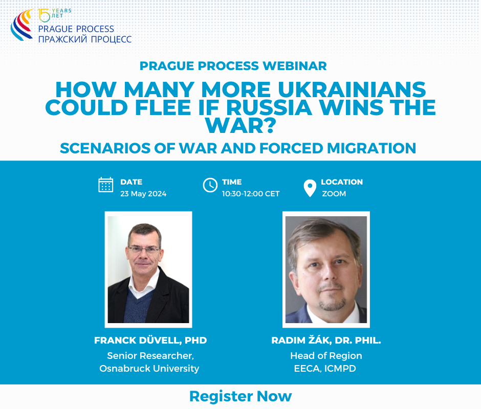 In the upcoming webinar ‘How many more Ukrainians could flee if Russia wins the war? Scenarios of war and forced migration’, taking place on Thursday, 23 May 2024 at 10:30 CET, Dr Franck Düvell will present the latest Prague Process Policy brief on forced migration from Ukraine. He will outline four potential war scenarios, each accompanied by corresponding forced migration flows, with the number of displaced individuals reaching up to 19 mio under the most severe scenario. These forecasts are based on a methodology, which demonstrated a high degree of accuracy in predicting the number of forcibly displaced in early 2022.