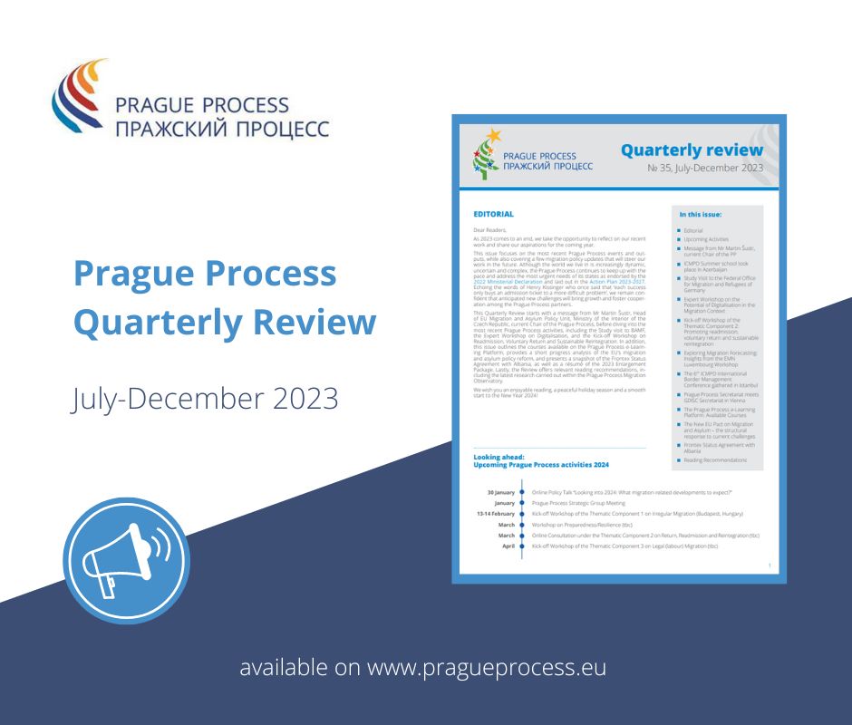 This Quarterly Review starts with a message from Mr Martin Šustr, Head of EU Migration and Asylum Policy Unit, Ministry of the Interior of the Czech Republic, current Chair of the Prague Process, before diving into the most recent Prague Process activities, including the Study visit to BAMF, the Expert Workshop on Digitalisation, and the Kick-off Workshop on Readmission, Voluntary Return and Sustainable Reintegration. In addition, this issue outlines the courses available on the Prague Process e-Learning Platform, provides a short progress analysis of the EU’s migration and asylum policy reform, and presents a snapshot of the Frontex Status Agreement with Albania, as well as a résumé of the 2023 Enlargement Package. Lastly, the Review offers relevant reading recommendations, including the latest research carried out within the Prague Process Migration Observatory.