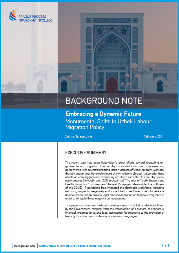 The recent past has seen Uzbekistan’s great efforts toward regulating organised labour migration. The country concluded a number of far-reaching agreements with countries hosting large numbers of Uzbek migrant workers, thereby supporting the employment of own citizens abroad. It also prioritized efforts on creating jobs and promoting employment within the country, especially among the youth, with 2021 proclaimed “The Year of Youth Support and Health Promotion” by President Shavkat Mirziyoyev. Meanwhile, the outbreak of the COVID-19 pandemic has impacted the domestic workforce, including returning migrants, negatively and forced the Uzbek Government to take additional measures to provide legal and social protection to labour migrants in