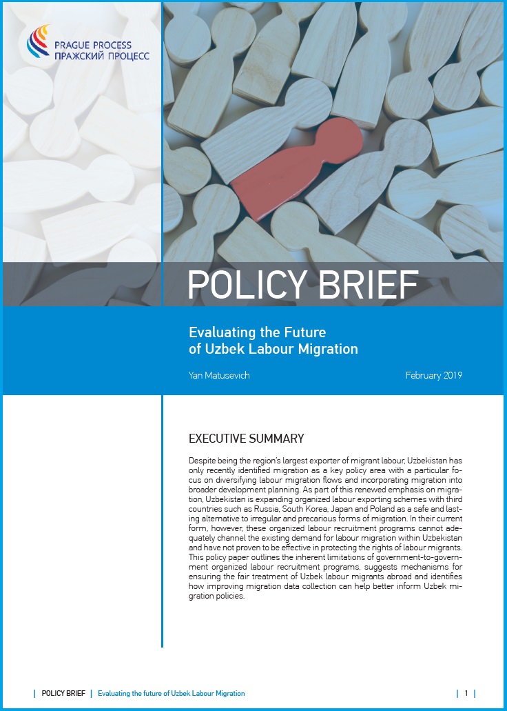 Despite being the region’s largest exporter of migrant labour, Uzbekistan has only recently identified migration as a key policy area with a particular focus on diversifying labour migration flows and incorporating migration into broader development planning. As part of this renewed emphasis on migration, Uzbekistan is expanding organized labour exporting schemes with third countries such as Russia, South Korea, Japan and Poland as a safe and lasting alternative to irregular and precarious forms of migration. In their current form, however, these organized labour recruitment programs cannot adequately channel the existing demand for labour migration within Uzbekistan and have not proven to be effective in protecting the rights of labour migrants. This policy paper outlines the inherent limitations of government-to-government organized labour recruitment programs, suggests mechanisms for ensuring the fair treatment of Uzbek labour migrants abroad and identifies how improving migration data collection can help better inform Uzbek migration policies.