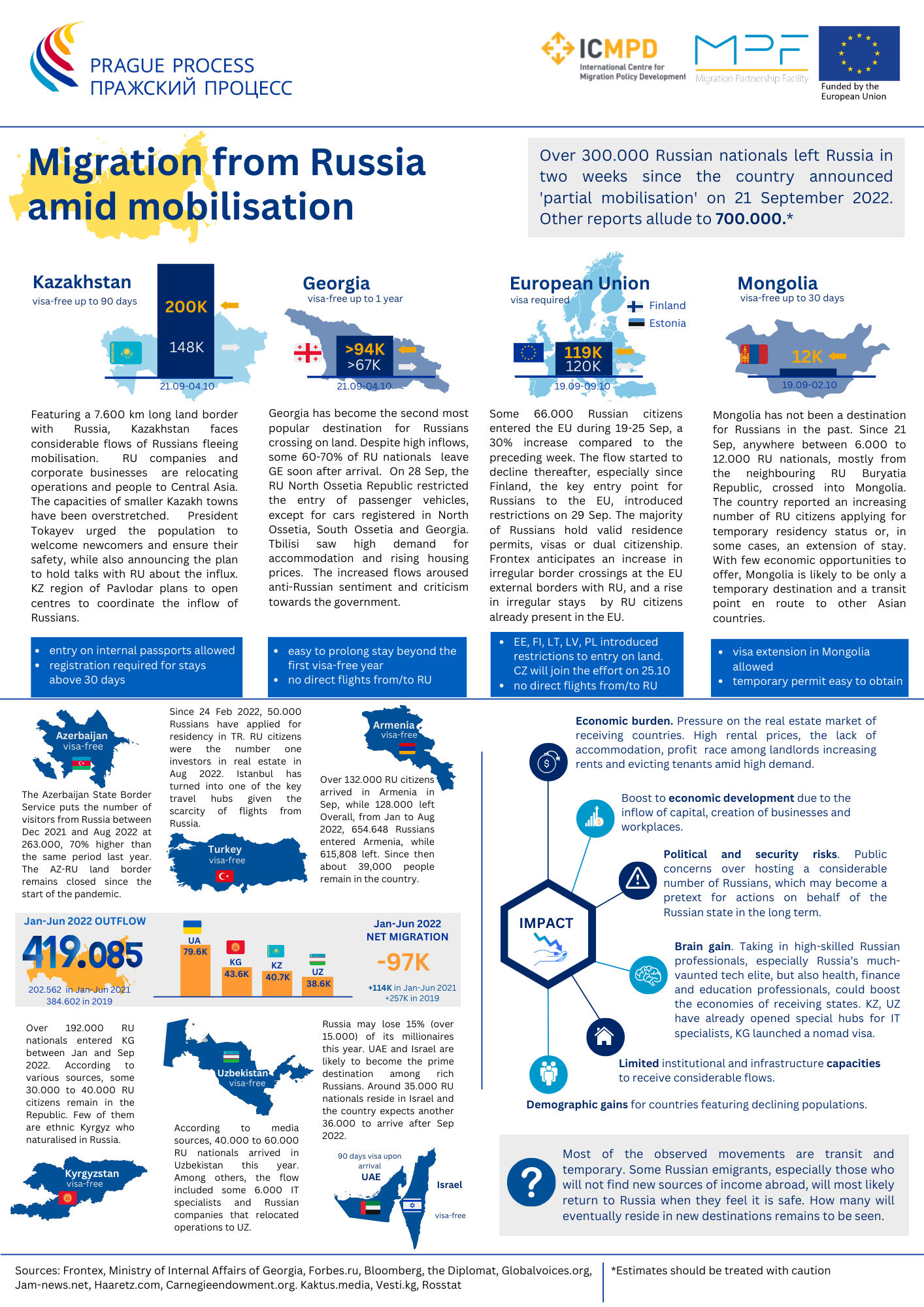 The infographic represents a snapshot of migration from Russia following the partial mobilisation that was announced in late September 2022. This visualisation was first published in the Prague Process Quarterly Review No 32 July-September 2022.