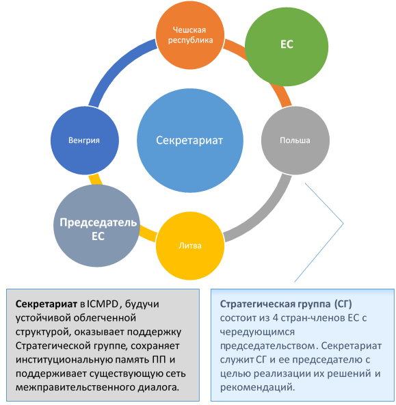 После периода руководства Чешской Республики (2009-2010) и Польши (2011-2017) старшие должностные лица согласились создать Стратегическую группу (СГ) Пражского процесса, состоящую из ограниченного числа государств с председателем, который назначается на основе принципа ротации. Созданный осенью 2017 года этот совместный орган управления в настоящее время состоит из Чешской Республики, Венгрии, Литвы и Польши. Страна, председательствующая в Совете ЕС, Европейская комиссия и Секретариат Пражского процесса дополняют состав Стратегической группы. ICMPD продолжает выполнять свои функции секретариата Пражского процесса, отвечающего за подготовку заседаний СГ и за выполнение решений и рекомендаций, выдвинутых Стратегической группой.
