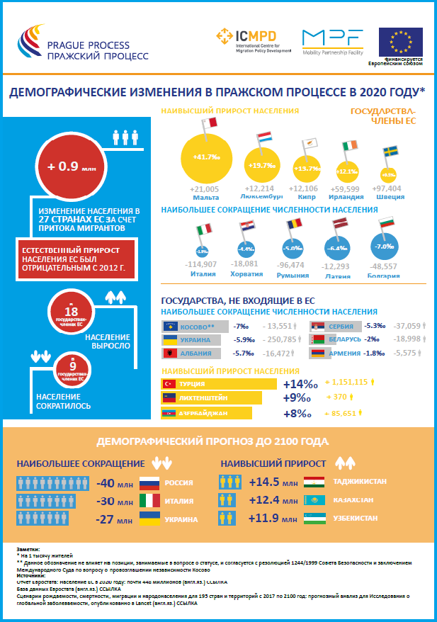 Инфографика отображает ключевые демографические изменения в регионе Пражского процесса в 2020 г., показывая наивысший прирост и наибольшее снижение численности населения, а также демографический прогноз до 2100 г. Визуализация была впервые опубликована в Квартальном обзоре Пражского процесса № 24 за июль-сентябрь 2020 г.