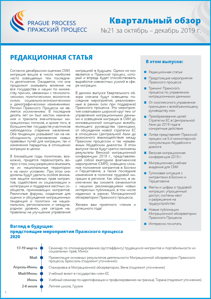 В данном выпуске Квартального обзора сначала будут освещены последние мероприятия, реализованные в рамках (или при поддержке) Пражского процесса. Эти мероприятия охватывали широкий круг тем: от управления миграционными данными и освещения миграции в СМИ до инновационной концепции всеобъемлющего руководства границами; от обсуждения новой стратегии ЕС в отношении Центральной Азии до возможного взаимодействия между Пражским процессом и так называемым Абудабским диалогом. В этом выпуске также будут кратко изложены результаты Венской миграционной конференции 2019 г., представляющей собой ежегодное флагманское мероприятие ICMPD, освещено сложное положение мигрантов в Боснии и Герцеговине, а также последние изменения в политике трудовой миграции в регионе. Как обычно, в заключении вы сможете ознакомится с нашими рекомендациями новых интересных публикаций, в том числе изданных в рамках Миграционной обсерватории Пражского процесса.