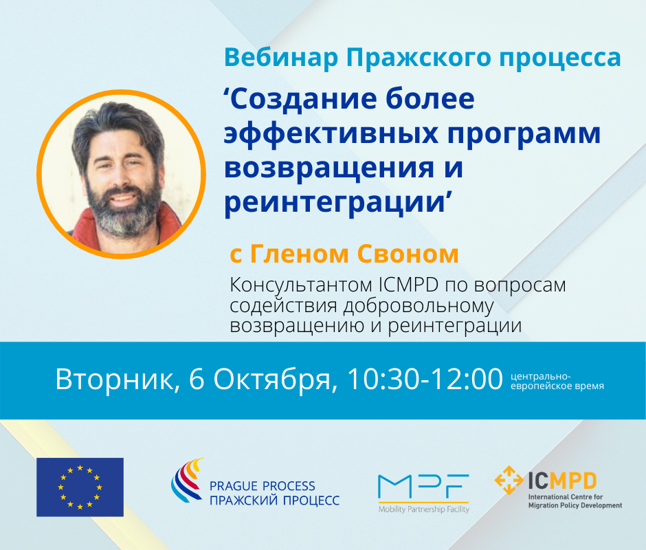 Восьмой вебинар Пражского процесса «Создание более эффективных программ возвращения и реинтеграции» с Гленом Своном, консультантом ICMPD по вопросам содействия добровольному возвращению и реинтеграции состоится 6 октября 2020 года в 10:30 утра по центрально-европейскому времени.