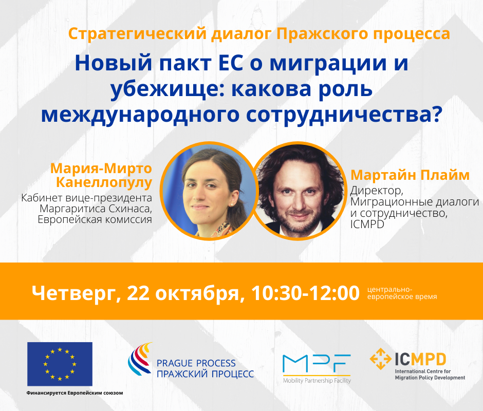 Стратегический диалог Пражского процесса «Новый пакт ЕС о миграции и убежище: какова роль международного сотрудничества?» с г-жой Марией-Мирто Канеллопулу, членом кабинета вице-президента Европейской комиссии по продвижению европейского образа жизни, Маргаритиса Схинаса, и г-ном Мартайном Плаймом, Директором миграционных диалогов и сотрудничества ICMPD состоится 22 октября 2020 года в 10:30 утра по центрально-европейскому времени.