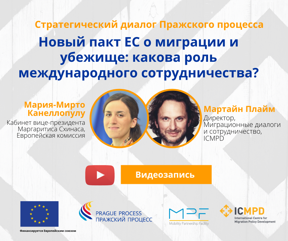 Стретегический диалог Пражского процесса «Новый пакт ЕС о миграции и убежище: какова роль международного сотрудничества?» с г-жой Марией-Мирто Канеллопулу, членом кабинета вице-президента Европейской комиссии по продвижению европейского образа жизни, Маргаритиса Схинаса, и г-ном Мартайном Плаймом, Директором миграционных диалогов и сотрудничества ICMPD, состоялся 22 октября 2020 года. Он осветил аспекты внешнего сотрудничества Пакта и возможные пути его практического применения.
