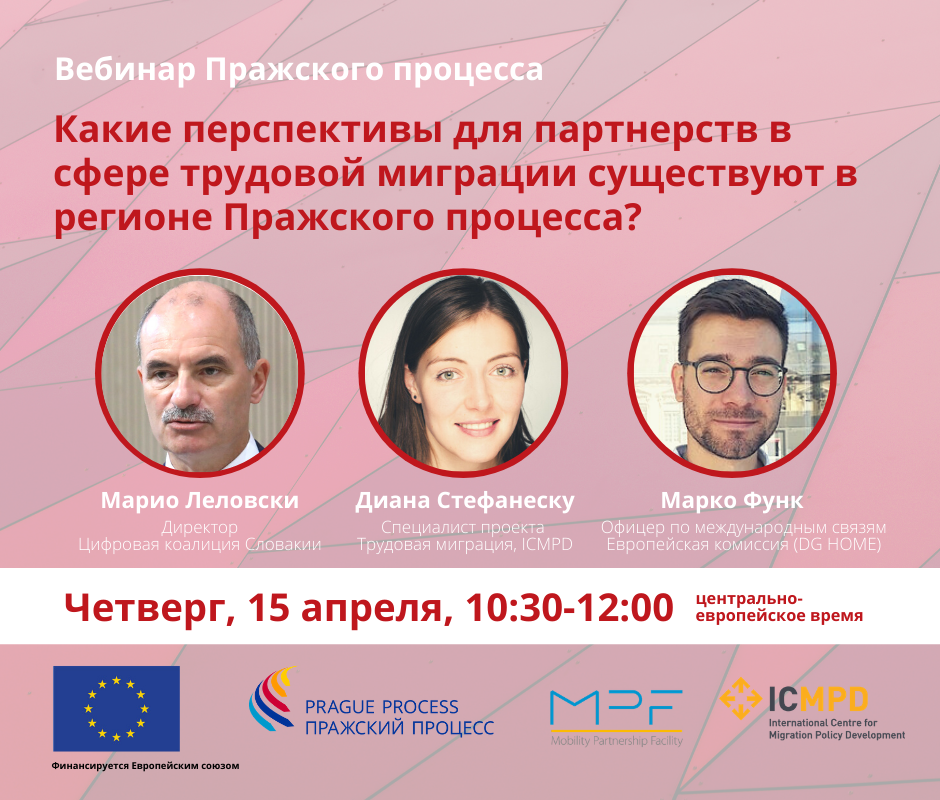 15 апреля 2021 года в 10:30 утра по центрально-европейскому времени состоится вебинар Пражского процесса «Какие перспективы для партнерств в сфере трудовой миграции существуют в регионе Пражского процесса? Извлеченные уроки из пилотных проектов по легальной миграции, финансируемых ЕС» c г-ном Марко Функом, офицером по международным связям, отдел международной стратегии Генерального директората по миграции и внутренним делам (DG HOME), Европейская комиссия, г-ном Марио Леловски, директором Цифровой коалиции Словакии, и г-жой Дианой Стефанеску, специалистом проекта - трудовая миграция, ICMPD.