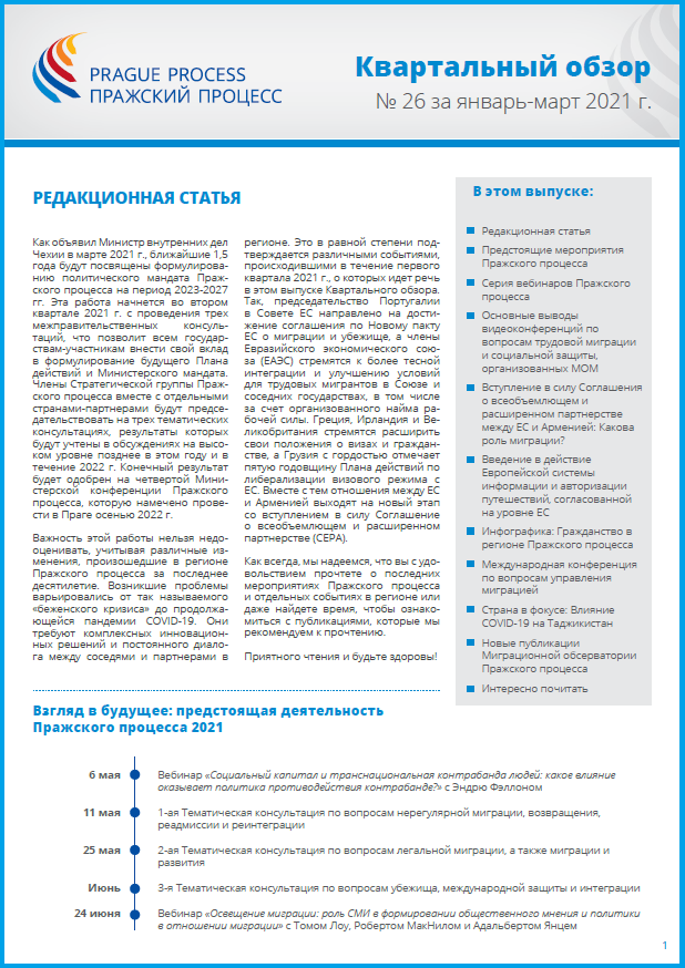 Как объявил Министр внутренних дел Чехии в марте 2021 г., ближайшие 1,5 года будут посвящены формулированию политического мандата Пражского процесса на период 2023-2027 гг. Различные изменения, произошедшие в регионе Пражского процесса за последнее десятилетие, требуют всеобъемлющих, новаторских решений и постоянного диалога между государствами-участниками. Это в равной степени подтверждается последними событиями, которые мы наблюдали в первом квартале 2021 года и осветили в этом выпуске Квартального обзора. Так, председательство Португалии в Совете ЕС направлено на достижение соглашения по Новому пакту ЕС о миграции и убежище, а члены Евразийского экономического союза (ЕАЭС) стремятся к более тесной интеграции и улучшению условий для трудовых мигрантов в Союзе и соседних государствах, в том числе за счет организованного найма рабочей силы. Греция, Ирландия и Великобритания стремятся расширить свои положения о визах и гражданстве, а Грузия с гордостью отмечает пятую годовщину Плана действий по либерализации визового режима с ЕС. Вместе с тем отношения между ЕС и Арменией выходят на новый этап со вступлением в силу Соглашение о всеобъемлющем и расширенном партнерстве (CEPA).