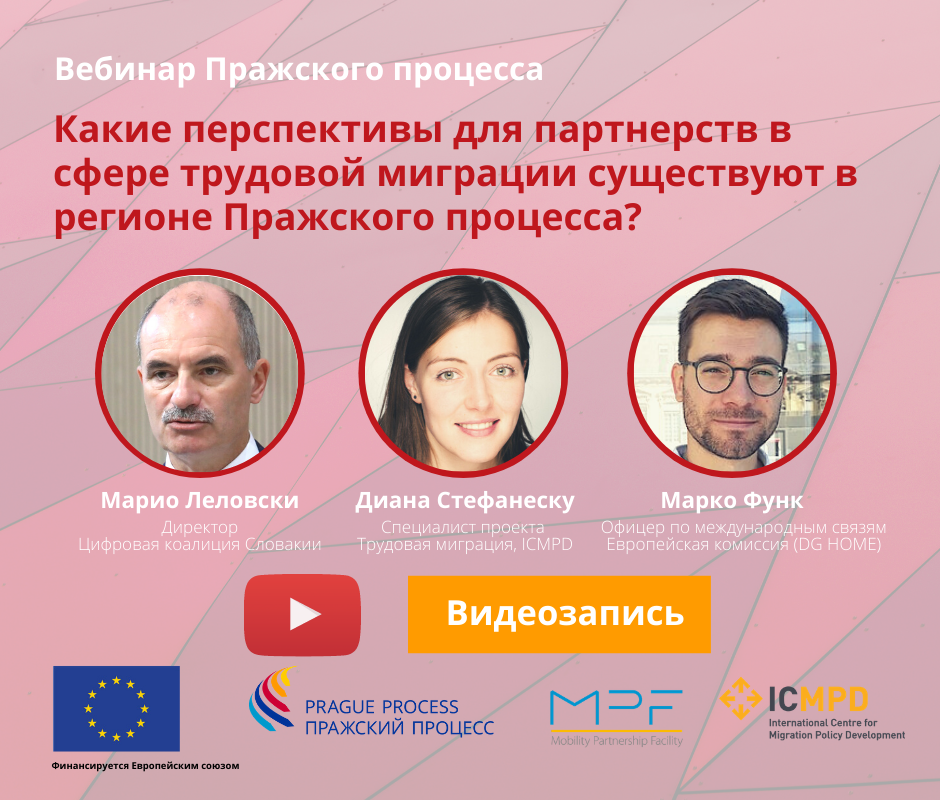 Вебинар Пражского процесса «Какие перспективы для партнерств в сфере трудовой миграции существуют в регионе Пражского процесса? Извлеченные уроки из пилотных проектов по легальной миграции, финансируемых ЕС» c г-ном Марко Функом, офицером по международным связям, отдел международной стратегии Генерального директората по миграции и внутренним делам (DG HOME), Европейская комиссия, г-ном Марио Леловски, директором Цифровой коалиции Словакии, и г-жой Дианой Стефанеску, специалистом проекта - трудовая миграция, ICMPD, состоялся 15 апреля 2021 г.