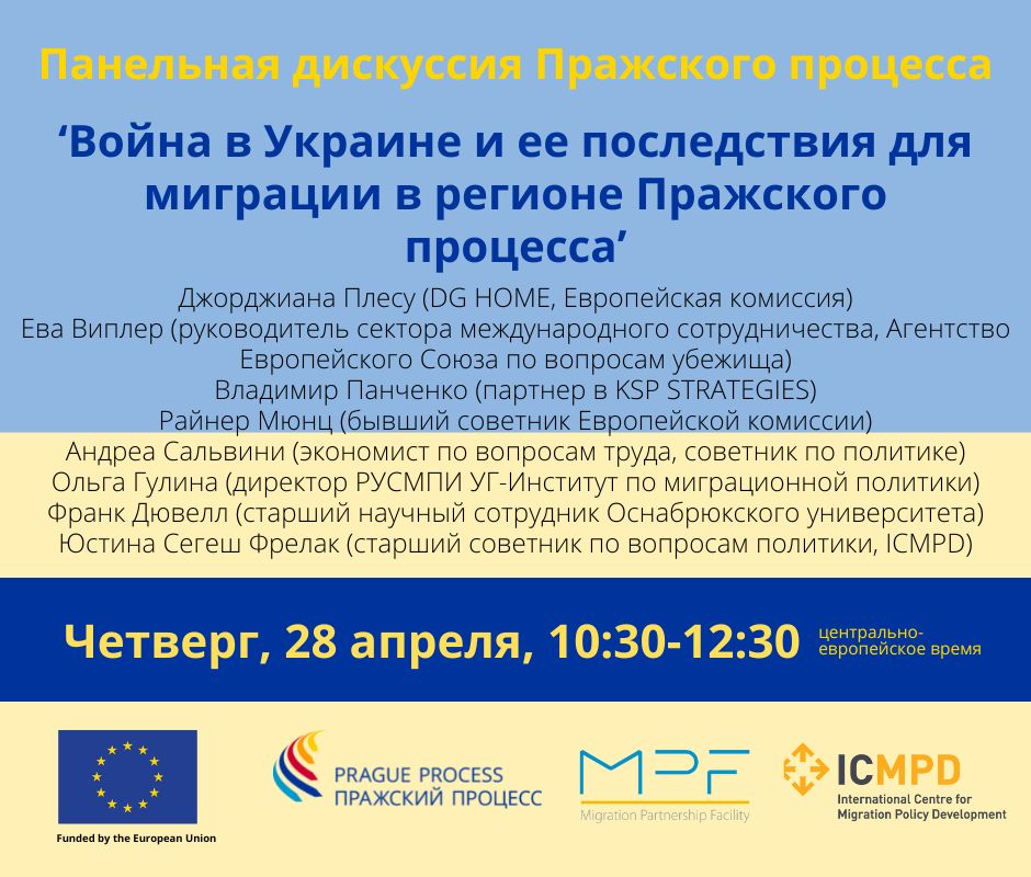 Панельная дискуссия Пражского процесса: «Война в Украине и ее последствия для миграции в регионе Пражского процесса» состоится в четверг, 28 апреля 2022 г., в 10:30 утра по центральноевропейскому времени.