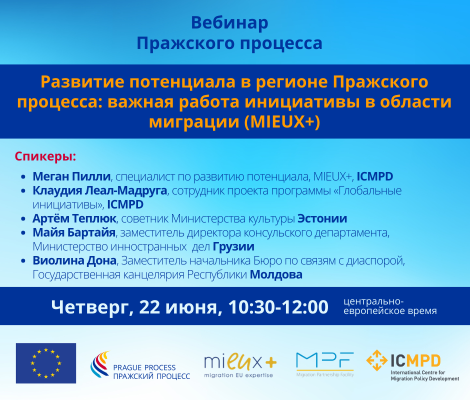 Вебинар Пражского процесса: «Развитие потенциала в регионе Пражского процесса: важная работа инициативы MIEUX+ в области миграции» состоится в четверг, 22 июня 2023 г., в 10:30 утра по центральноевропейскому времени.