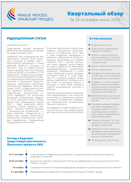 В данном Квартальном обзоре представлены мероприятия, запланированные на оставшуюся часть года, а также подробная информация о различных мероприятиях Пражского процесса, организованных в первой половине 2023 г. Данная публикация также содержит анализ реформы Закона Германии об иммиграции квалифицированных специалистов, подробную информацию о новой схеме временной защиты Молдовы, последние новости о «Годе навыков» ЕС, основные выводы конференции Европейской миграционной сети (ЕМС) по вопросам климата и миграции, а также обзор последних событий миграционной политики в Албании.