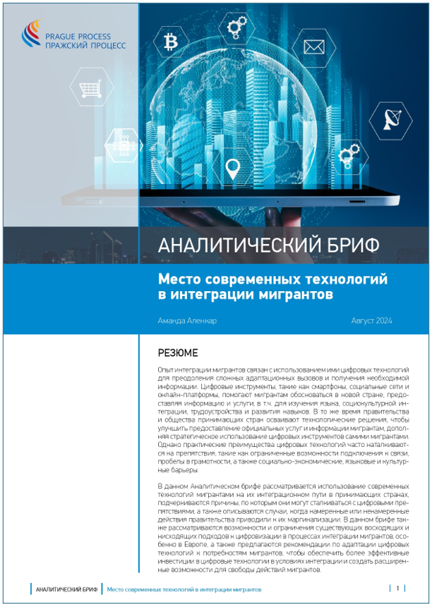 В данном Аналитическом брифе рассматривается использование современных технологий мигрантами на их интеграционном пути в принимающих странах, подчеркиваются причины, по которым они могут сталкиваться с цифровыми препятствиями, а также описываются случаи, когда намеренные или ненамеренные действия правительства приводили к их маргинализации. В данном брифе также рассматриваются возможности и ограничения существующих восходящих и нисходящих подходов к цифровизации в процессах интеграции мигрантов, особенно в Европе, а также предлагаются рекомендации по адаптации цифровых технологий к потребностям мигрантов, чтобы обеспечить более эффективные инвестиции в цифровые технологии в условиях интеграции и создать расширенные возможности для свободы действий мигрантов.