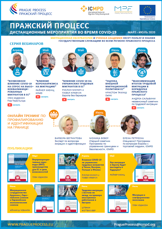 Визуализация отображает дистанционные мероприятия Пражского процесса, организованные в марте-июле 2020 г. в соответствии с одобренным Планом действий Пражского процесса в условиях черезвычайной ситуации в связи с пандемией коронавируса. Визуализация включает прямые ссылки на выпущенные в этот период публикации и видеозаписи.